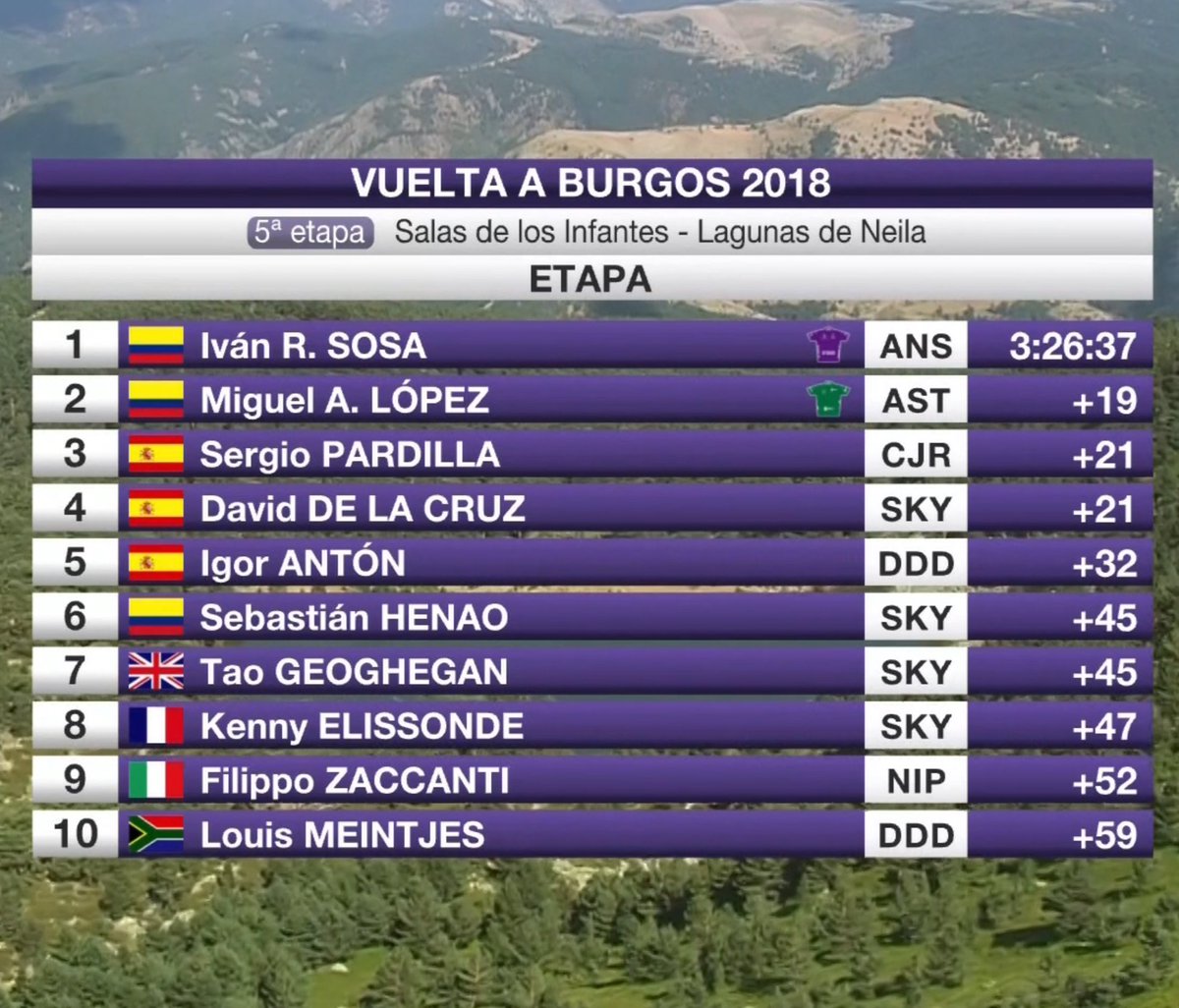 El joven ciclista de 20 años, Ivan Ramiro Sosa (Androni-Giocatelli) se llevó la última etapa en Lagunas de Neila para coronarse en la clasificación general de la Vuelta a Burgos. Se encontraba a dos segundos de Miguel Ángel López (Astana Team) que llevaba el mallot de líder y aprovechó esa pequeña diferencia.