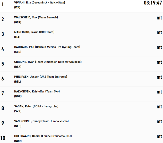 Por su parte, Elia Viviani partirá esta madrugada como líder de la general en una jornada donde, aparentemente, no tendrá problemas para mantener el liderato. Recordar que la segunda etapa también ha sido recortada hasta los 122Km debido a las condiciones meteorológicas.