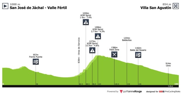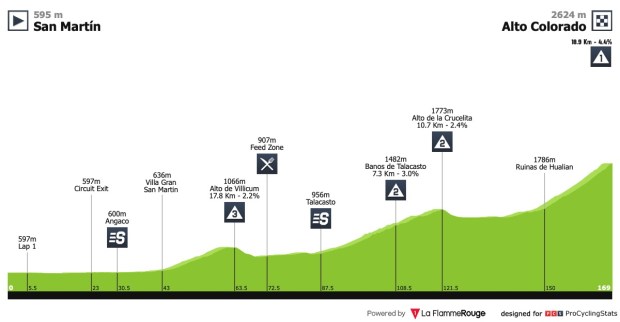 Tras el día de descanso, comenzará a perfilarse la general de la Vuelta a San Juan con una etapa de hasta 169Km y final en alto. Tres puertos de segunda categoría servirán para dar paso al Alto Colorado, final de etapa, con 18,9Km al 4,4% de media.