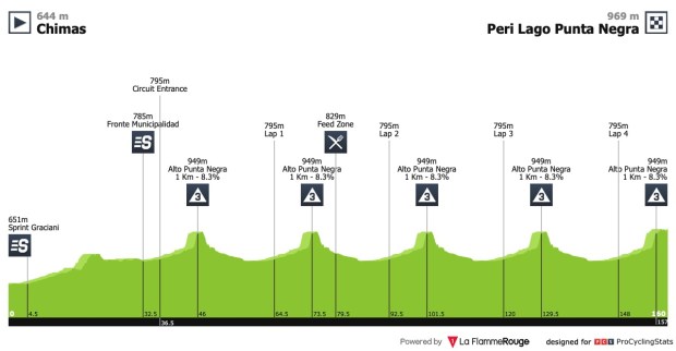 La segunda entrega de la Vuelta a San Juan 2019 presentará 160Km. Los primeros 36Km tendrán un terreno ligeramente ascendente hasta que el pelotón entre en un circuito al que se darán cuatro vueltas para completar los 160Km. Durante el recorrido se realizará la ascensión al Alto Punta Negra con un kilómetro al 8% de media. Un alto que será, además, final de etapa.