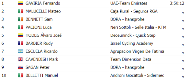 Finalmente, fue Gaviria quien se llevó el gato al agua en un sprint donde Peter Sagan parecía ser el lanzador de Sam Bennet. Por su parte, Hodej también intentó hacer bueno el trabajo del Deceunink-Quick Step, pero un inmenso Malucelli acompañó al irlandés del Bora y al colombiano del UAE en el podio de la etapa.