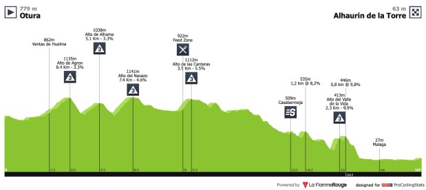 La última etapa, en principio, no será muy decisiva para la clasificación general. Antes de llegar a Alhaurin de la Torre, la serpiente multicolor deberá superar hasta cinco puertos, todos ellos de tercera categoría, coronando el último a 30 de meta. Esos últimos kilómetros totalmente llanos hacen imposible cualquier intento de mover la general desde lejos.