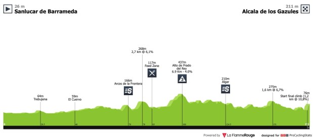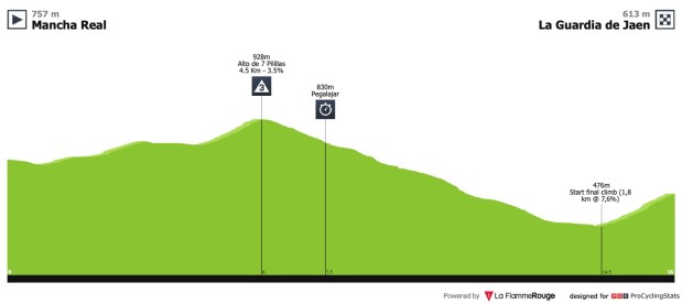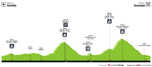 Ahora sí, tras la crono momento de que los escaladores salgan a relucir. Un puerto de tercera categoría (4,4Km al 2,8%) dará paso a los dos altos de primera categoría que compondrán la jornada. El primero de ellos se superará en el kilómetro 49, mientras que el segundo, se ascenderá nada más superar un segunda (6,2Km al 5,1%), se compone de 7,3Km con una pendiente media del 9,6% y, tras alcanzar la cima del Alto de Hazallanas, la carretera tendrá más de 20Km en sentido descendente para llegar a la meta de Granada.