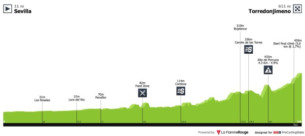 La segunda etapa superará los 200Km y con el final en Torredonjimeno supondrá la primera etapa de montaña. Una montaña acumulada en los últimos kilómetros con el alto de tercera categoría (4,3Km al 4,9%) y el final donde se deberán superar algo más de cinco kilómetros a casi un 3% de media.
