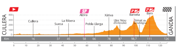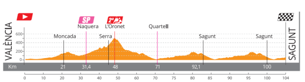 Último día de competición en la Comunidad Valenciana con salida en Valencia y final en Sagunto. Por delante 104Km donde L’Oronet (2º categoría) será el único puerto puntuable de la jornada. Un día donde, a priori, no se moverá la general y que se decidirá al sprint.