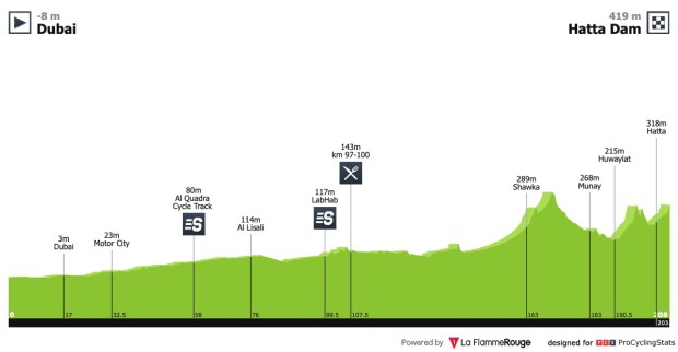 Tras Jebel Hafeet, se presenta una jornada larga, más de 200Km, y con varias ascensiones. Los primeros 150Km transcurrirán por repechos y falsos llanos siempre en sentido ascendente. Mientras que, en los últimos kilómetros de la jornada, se encadenarán hasta tres ascensiones las cuales terminarán de abrir las diferencias en la general.