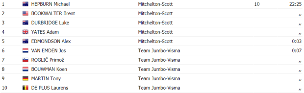 De esta forma, el Mitchelton Scott decidía que su primer corredor en cruzar la línea de meta fuera Michael Hepburn para colocarse como líder de la general. Además, equipos importantes para la general como Sky a 47», Bahrain-Merida a 1′ o Movistar Team a 1’32» perdieron demasiado tiempo para un recorrido cuya longitud era de 21km.