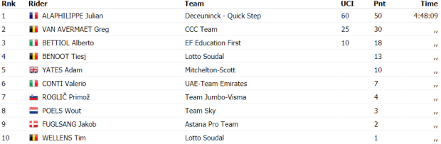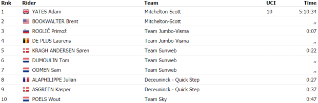Primoz Roglic quería volver a intentarlo y solamente podían seguir su ritmo tanto Lutsenko como Alaphilippe, aunque más adelante se incorporaron varios corredores a este trío. Finalmente, en la «cuesta» de meta se impuso el corredor del Deceuninck-Quick Step venciendo a Van Avermaet y Clarke. Además, la etapa de hoy sirvió para que Adam Yates recogiera el maillot de líder de su compañero Hepburn.