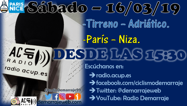 En Demarraje estamos a punto de cumplir los 100 programas y por ello sustituiremos el programa de mañana, viernes 15 de marzo, por una edición especial para este mismo sábado 16 con el objetivo de contaros en directo el 4º etapa de la Tirreno – Adriático y la 7º entrega de la París – Niza. De esta forma, desde las 15:30, cubriremos en vivo dos de las mejores carreras del calendario World Tour y donde los corredores se dejan todo para conseguir sendos trofeos.
