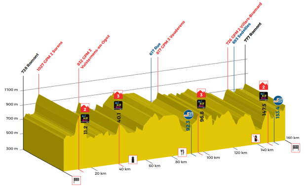 La primera jornada en línea contará con un total de 168Km. Durante el recorrido se deberán superar hasta cinco puertos de segunda categoría. Tras la última ascensión al Col de la Tourne quedarán 25Km para un final con varios repechos y donde cualquiera lo puede intentar desde lejos. También podría dar opciones a la fuga.