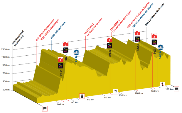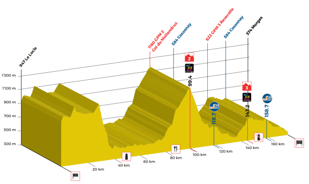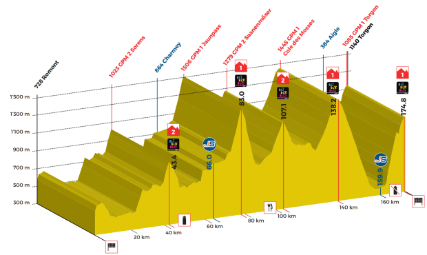 Jornada de alta montaña con 176Km y hasta cinco ascensiones. Dos de segunda categoría y tres de primera. Primer y único final en alto precedido de la ascensión a Cole des Mosses (1º Categoría) con 13,5Km al 4,2% de media y donde podría empezar a moverse la carrera. El final en alto será tras coronar Torgon, ascensión dura de 11,6Km a una media del 8,3% y con pendientes máximas del 12%.
