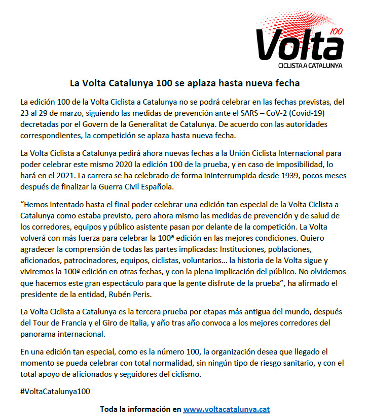 Adiós a la Volta a Catalunya Publicado en 12 marzo, 2020 por Redacción Demarraje La organización de la Volta a Catalunya ha comunicado la suspensión de la carrera a través del siguiente comunicado: Comparte: Haz clic para compartir en X (Se abre en una ventana nueva) X Haz clic para compartir en Facebook (Se abre en una ventana nueva) Facebook Haz clic para compartir en WhatsApp (Se abre en una ventana nueva) WhatsApp Haz clic para enviar un enlace por correo electrónico a un amigo (Se abre en una ventana nueva) Correo electrónico Haz clic para compartir en Telegram (Se abre en una ventana nueva) Telegram Haz clic para compartir en Reddit (Se abre en una ventana nueva) Reddit Me gusta Cargando... Relacionado CARRERASVolta a Catalunya