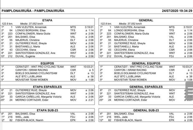 Finalmente Van Vleuten llegaba en solitario a Pamplona para levantar, por segundo día consecutivo, los brazos como vencedora de la segunda Clásica Féminas de Navarra. En segunda posición iba a llegar Elisa Longo, mientras que el tercer puesto ha sido para la italiana Maria Giulia Confalonieri ganando el sprint del grupo. Las mejores españolas han sido Sheyla Gutiérrez y Ane Santesteban 6º y 9º, respectivamente.
