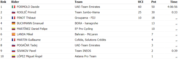 Finalmente Davide Formolo iba a aguantar la diferencia logrando la victoria con apenas medio minuto de ventaja sobre el grupo de los mejores. Un grupo donde, en los últimos metros, iba a afianzar su liderato Primoz Roglic con unos pocos metros de ventaja sobre el resto de favoritos y recogiendo la bonificación como segundo de la etapa. En tercera posición finalizaba Pinot.