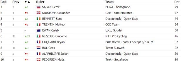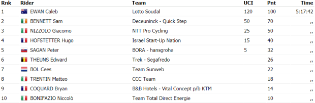 En los últimos kilómetros se vivía la típica lucha por la posición camino de unos dos últimos kilómetros prácticamente rectos y sin elementos que pudieran estirar el pelotón. Parecía que Sam Bennett se iba a llevar la victoria de etapa, pero Caleb Ewan aparecía por detrás con mucha fuerza que le convertía en vencedor por delante del irlandés. Tercero fue Giacomo Nizzolo.