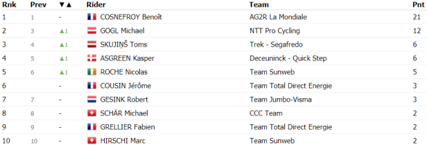 Cuando se acercaba la Col des Lèques (tercera categoría) Cosnefroy y Pérez volvieron a disputarse los puntos de la montaña donde Cosnefroy se llevó el único punto que había dejado Cousin. Durante el descenso de este puerto, Anthony Pérez, virtual líder de la montaña, tenía que abandonar tras una caída donde se rompía la clavícula.