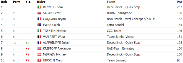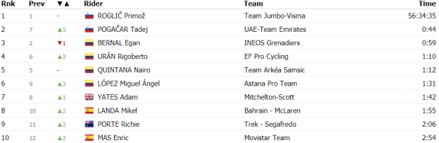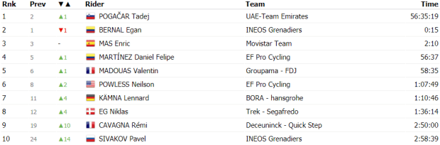Finalmente Martínez y Kämna daban caza a Schachmann para pelear por la victoria de etapa que fue para Daniel Felipe Martínez por delante de Kämna. Entre los favoritos Roglic y Pogacar consiguieron 14 segundos sobre Landa, Porte y López, algo más de treinta sobre Bernal, Urán y Quintana, mientras que Martin y Bardet perdieron 2:30 y casi 3′, respectivamente.