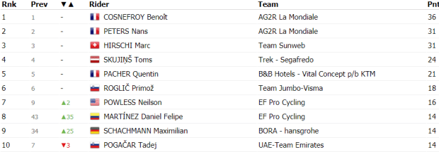 Daniel Felipe Martínez se lleva la victoria por delante de Kämna después de que el colombiano realizase un gran trabajo. Entre los favoritos hubo algunas diferencias con los eslovenos abriendo más hueco.