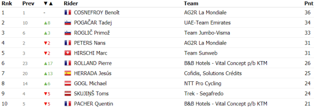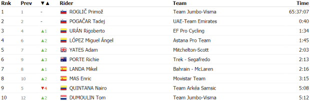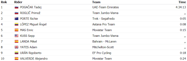 Cuando restaban siete kilómetros para la cima arrancaba Adam Yates, aunque fue neutralizado un kilómetro más adelante. Entre el grupo de favoritos no hubo más movimientos y, ya dentro del último kilómetro, la victoria fue para Pogacar por delante de Roglic y Porte. Apenas hubo diferencias con López, Urán, Enric Mas, Landa y Valverde, mientras que Martin llegó a más de tres minutos, a casi cuatro llegó Quintana y Bernal lo hizo a más de seis.