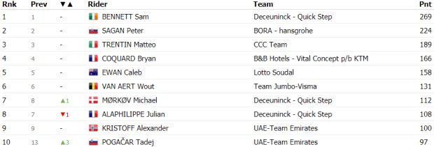 La escapa del día iba a contar con ocho unidades: Kévin Ledanois (Arkéa-Samsic), Simon Geschke, Matteo Trentin (CCC Team), Jesús Herrada (Cofidis), Marco Marcato (UAE Team Emirates), Niccolo Bonifazio (Total Direct Energie), Michael Gogl (NTT Pro Cycling) y Pierre Rolland (B&B Hotels-Vital Concept). En el pelotón, donde mandaba Jumbo Visma, permitían este grupo delantero, mientras que en el paso por el sprint intermedio Bennett conseguía dos puntos más que Sagan.