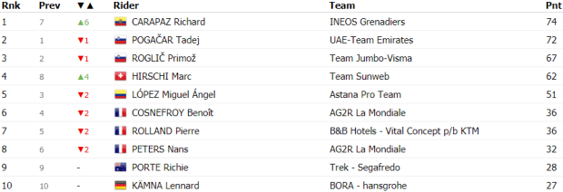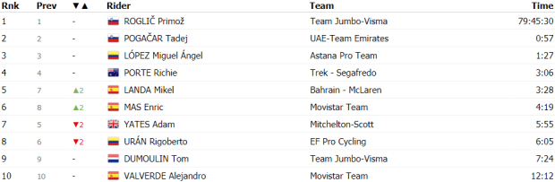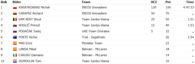 Finalmente la victoria fue para Kwiatkowski por delante de su compañero Carapaz. Tercero fue Van Aert llegando el primero del grupo de favoritos donde llegaron, además, Roglic, Pogacar, Landa, Mas y López. Por su parte, Urán y Yates perdieron bastante tiempo.