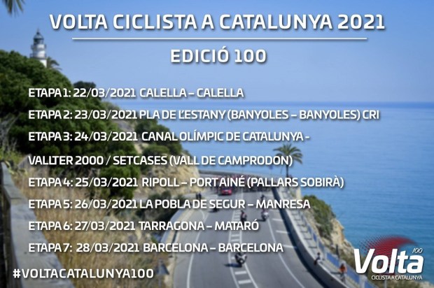 La Volta Ciclista en Catalunya comunica que para su edición número 100, que finalmente se disputará del 22 al 28 de marzo de 2021 después del aplazamiento forzoso debido a la pandemia en 2020, mantendrá el atractivo y exigente recorrido que tenía previsto, después de la confirmación de todos los municipios implicados.