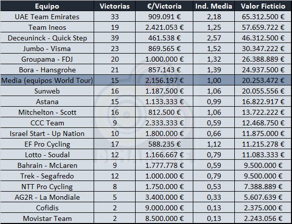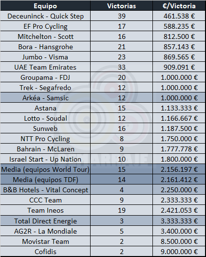 Como es habitual durante las últimas temporada, Deceuninck – Quick Step es el equipo al que más ‘barato’ le cuesta cada victoria. En esta ocasión el coste no alcanza los 500.000€ por victoria. EF Pro Cycling confirma la buena temporada 2020 que realizó, mientras que Arkéa – Sámsic se sitúa por encima de once equipos World Tour con sus doce victorias. Por el lado contrario destacan tanto Movistar como Cofidis rozando los 10 millones de euros por cada una de las dos victorias conseguidas.