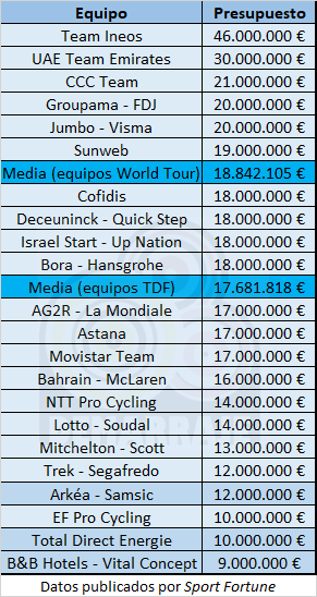 Gracias a los datos publicados por Sport Fortune, sabemos que, una temporada más, el Team Ineos es el equipo con el presupuesto más alto (46 millones), mientras que el segundo equipo en esta clasificación sería el UAE Team Emirates con 30 millones. Por su parte, la mayoría de los equipos World Tour se mueven en cifras muy parecidas entre los 12 y los 20 millones de presupuesto. Además, en esta ocasión hemos incluido a los tres equipos de la categoría ‘Pro Tour’ que fueron invitados al Tour de Francia: Arkéa – Sámsic, Total Direct Energie y B&B Hotels – Vital Concept.