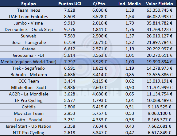 Para empezar cabe explicar el fundamento que se ha usado en el siguiente estudio. Hemos supuesto que el mundo del ciclismo es un ‘mercado‘ donde cada equipo tiene una asignación inicial -presupuesto- y que podrá utilizar para comprar ciertos ‘productos’. Este mercado lo vamos a analizar desde dos vías: los puntos UCI y las victorias conseguidas. Por lo tanto, esos ‘productos’ disponibles serán, en primer lugar, puntos, mientras que luego los convertiremos en victorias. De esta forma realizamos un análisis más completo para averiguar cómo ha rentabilizado cada equipo su presupuesto durante la temporada 2020.