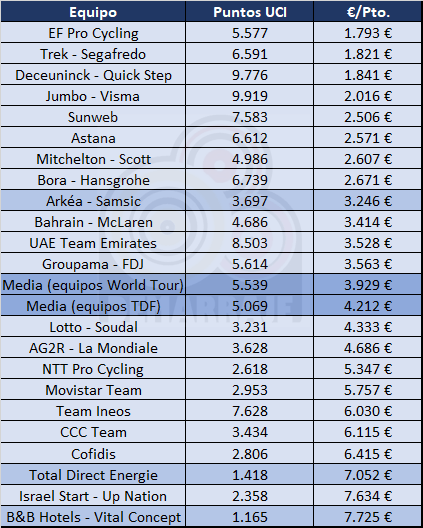 Con el presupuesto y los puntos de cada equipo en la mano, hemos averiguado el ‘precio’ que ha tenido que pagar cada escuadra por los puntos obtenidos en 2020. Desde esta perspectiva confirmamos la gran temporada del equipo EF Pro Cycling no llegando a ‘pagar’ más de 1.800€ por cada punto. Eso sí, le siguen muy de cerca tanto el Trek – Segafredo como el Deceuninck – Quick Step. Por su parte, Arkéa – Sámsic confirma su gran temporada situándose por encima de la media, mientras que el único representante español eleva casi a 6.000€/punto ese coste.