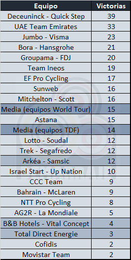 Por último, vamos a ver el valor ficticio de cada equipo World Tour en función de las victorias cosechadas. Desde este punto de vista obtenemos resultados mucho más abultados y podemos ver como hay dos equipos –UAE Team Emirates y Deceuninck – Quick Step– que superarían el doble de su presupuesto inicial. En el caso del equipo Emirates, su valor superaría al Team Ineos que es el conjunto con mayor presupuesto en 2020. En el lado contrario destacan los datos de Cofidis y Movistar que llegarían a perder un 87% de su valor.