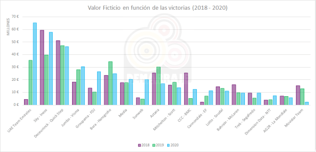Por último y como hemos realizado con los puntos UCI, calculamos el valor ficticio de cada equipo en función a un equipo ideal que será la media de todos los conjuntos World Tour. Los equipos que más han incrementado su valor durante los últimos tres años son UAE Team Emirates, Jumbo – Visma, Groupama y Sunweb. En el lado contrario vemos a conjuntos como Movistar Team o AG2R que han ido perdiendo cierto valor cada temporada.
