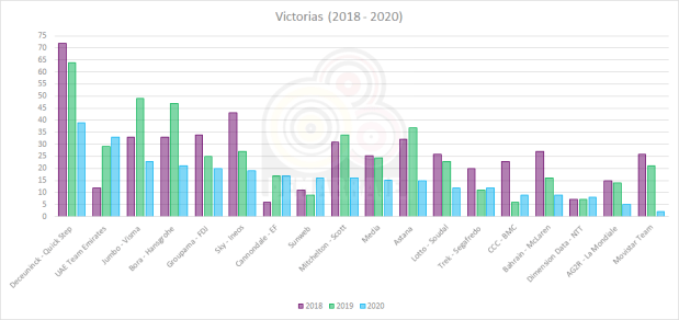 La segunda arista de nuestro estudio es el número de victorias cosechadas. A continuación se presentan las victorias de los equipos World Tour entre los años 2018 y 2020.