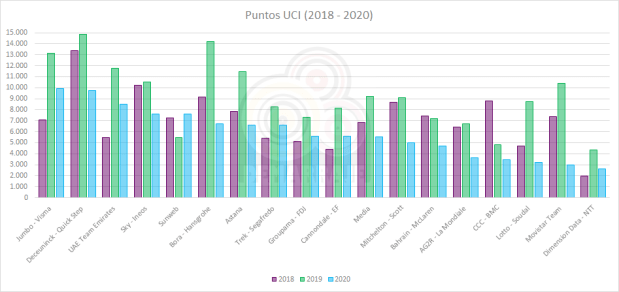 En estas tres últimas temporadas, entre 2018 y 2020, los cambios en los equipos World Tour no han sido demasiado significativos. El cambio más abultado, y que nos hará tomar con cautela sus datos, es la fusión entre el equipo BMC y el CCC. Además, ha habido cambios de patrocinio como Sky por Ineos y Cannondale por Education First.