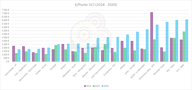 Con los puntos conseguidos y el presupuesto de cada conjunto hallábamos el ‘coste’ en euros de cada punto. Hay que destacar que 2020 ha sido un año diferente y con un menor número de carreras por lo que repercute en el número de puntos y la cantidad de victorias. En la evolución de ese ‘coste’ observamos equipos que han mejorado entre 2018 y 2019, pero en 2020 se distorsionaban los datos. En el lado contrario vemos a Movistar, Ineos o CCC, tres equipos que en 2020 no han obtenido los mejores resultados.