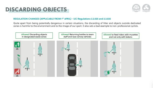 Los bidones solo se podrán arrojar en las zonas habilitadas para ello. Habrá cada 40 kilómetros, por lo que si en el futuro quieres ir a ver una carrera ciclista, y eres de los que le gusta recoger bidones, mira bien qué zonas están habilitadas. Además, se le penalizará con sanciones de tiempo y dinero arrojar bidones sobre la calzada y/o fuera de la zona habilitada