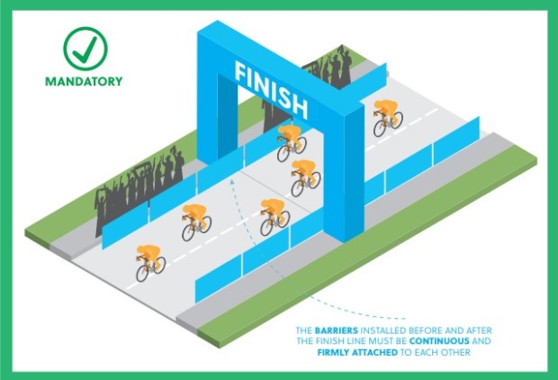 Uno de los puntos que ha querido trabajar la UCI es la posición de las vallas protectoras en la línea de meta. Con este nuevo cambio, se prohíbe que las vallas sobresalgan por debajo (a la altura de la ruedas), y estará prohibido que la señalización de los metros que queden para la meta sobresalgan por fuera de las vallas. Además, la pancarta de meta o de sprint intermedio tendrá que estar puesta por fuera de la calzada.