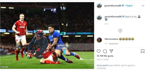 Todo el mundo sabe que Geraint Thomas es un fanático del rugby, y fiel seguidor de la selección de Gales. También se conoce por cómo comenta siempre las cosas en twitter que le gusta mucho el humor. Y como para reírte lo primero que tienes que hacer es saber reírse de uno mismo, Thomas, que este sábado sufrió una caída a pocos metros de cruzar la línea de meta, ha querido mofarse de esa caída subiendo esta foto en su instagram. En ella aparece cogiendo un balón de rugby y haciendo un ensayo.
