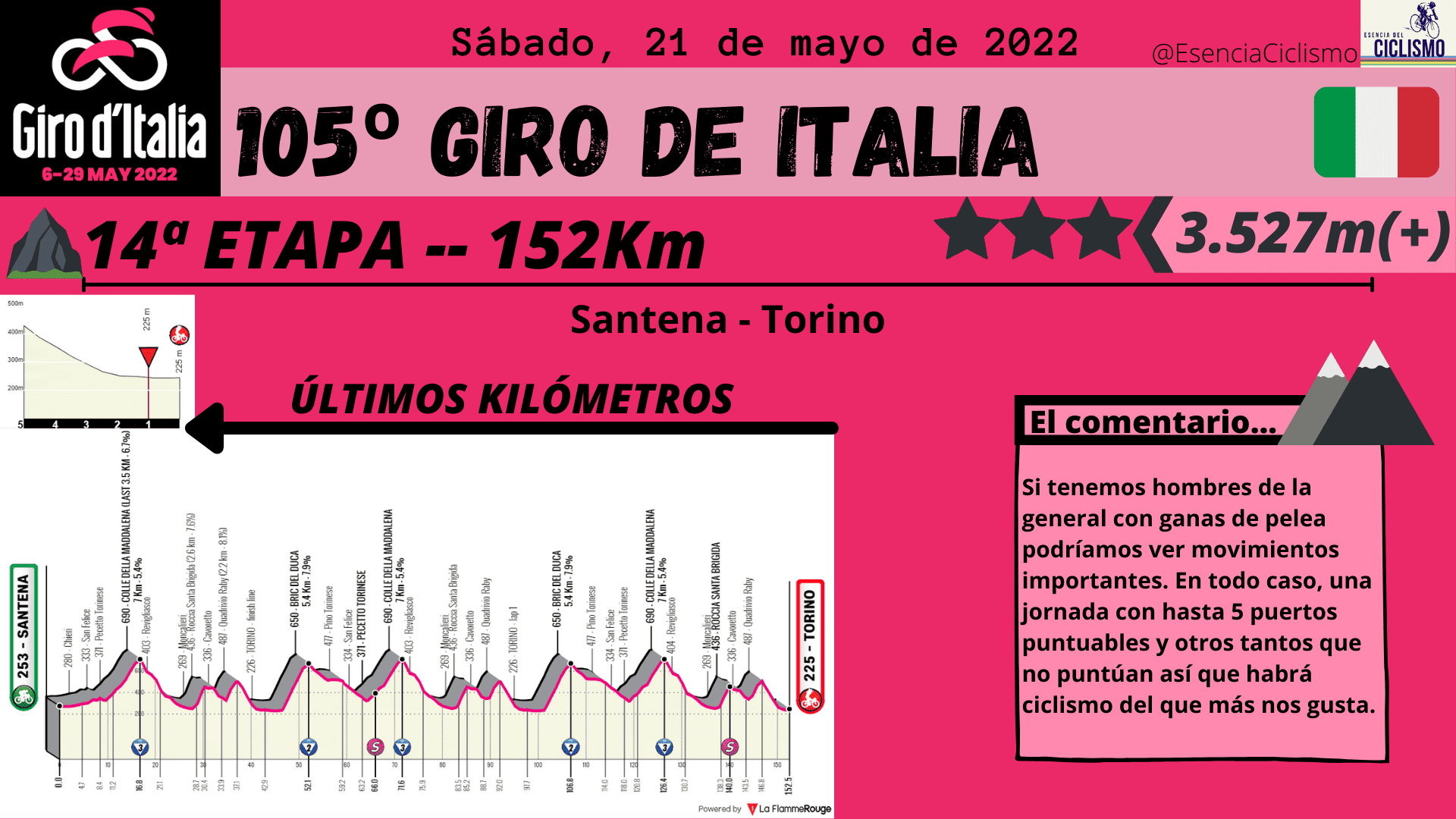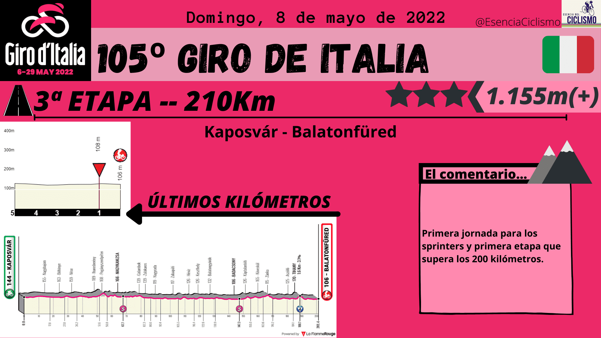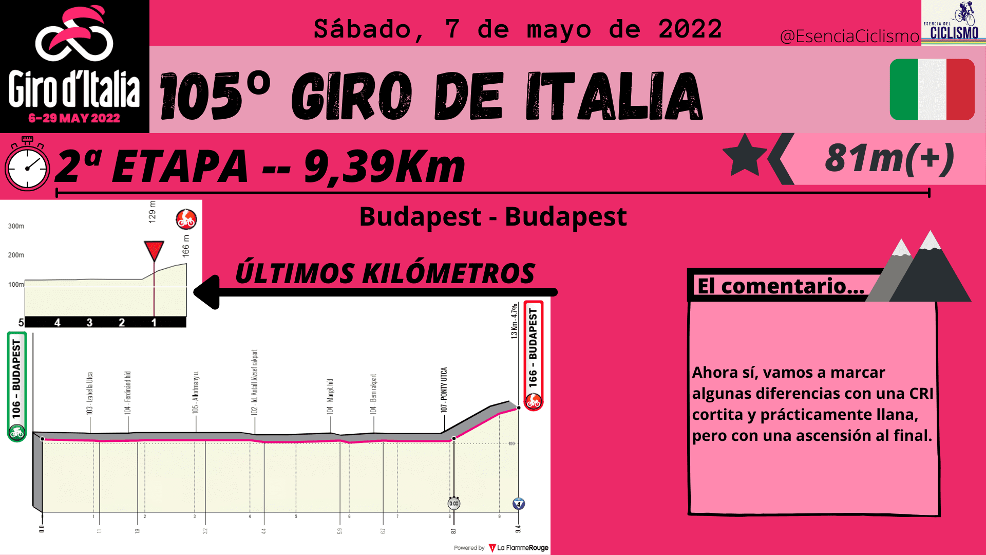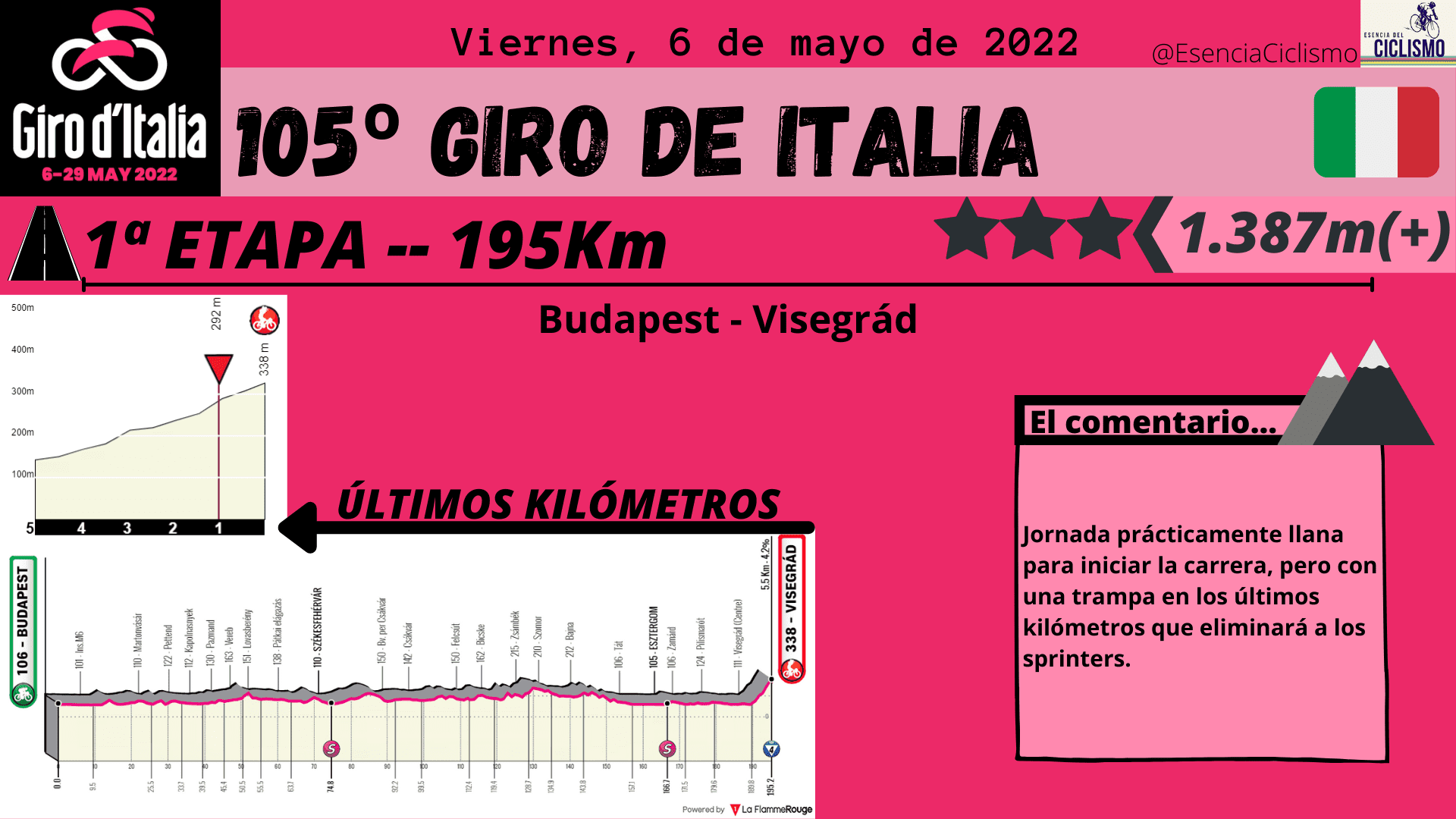 Las tres primeras etapas del Giro de Italia se desarrollarán en suelo húngaro. La primera jornada ya esconde una trampa en la parte final con una ascensión donde las rampas máximas alcanzan el 14% y donde la primera maglia rosa deberá ser alguien de calidad. Además, la CRI de 10km prevista para el segundo día también esconde una ‘trampa’ en la parte final por lo que se verán más diferencia de las previstas. Por su parte, el último día en suelo húngaro está llamado para los hombres más veloces.