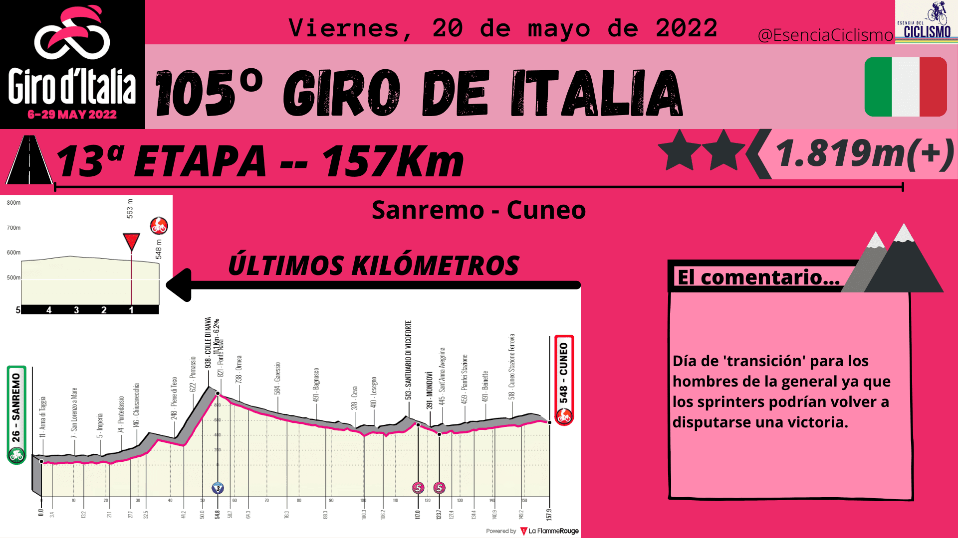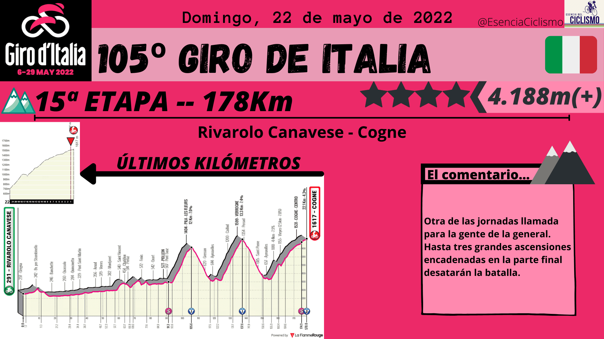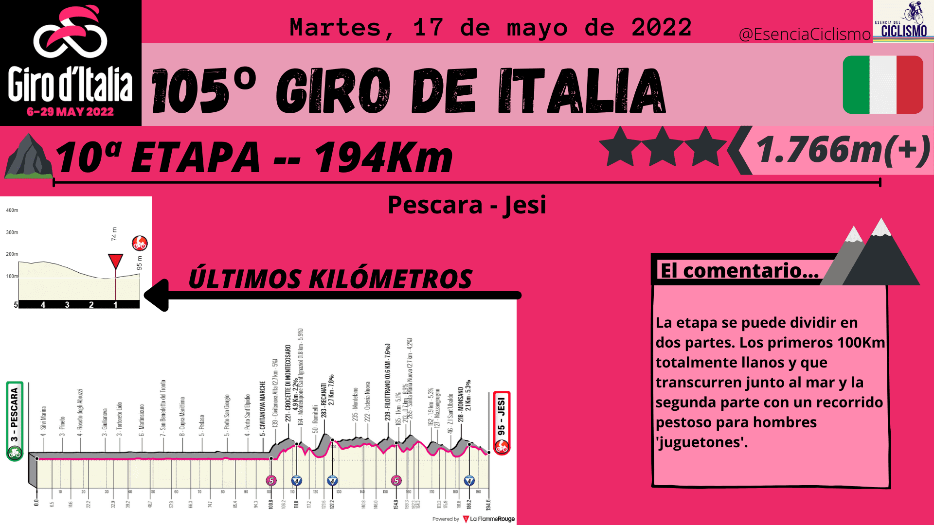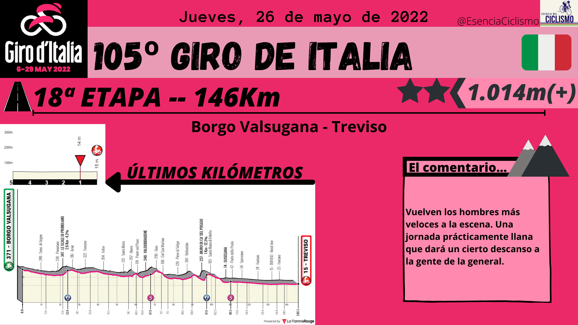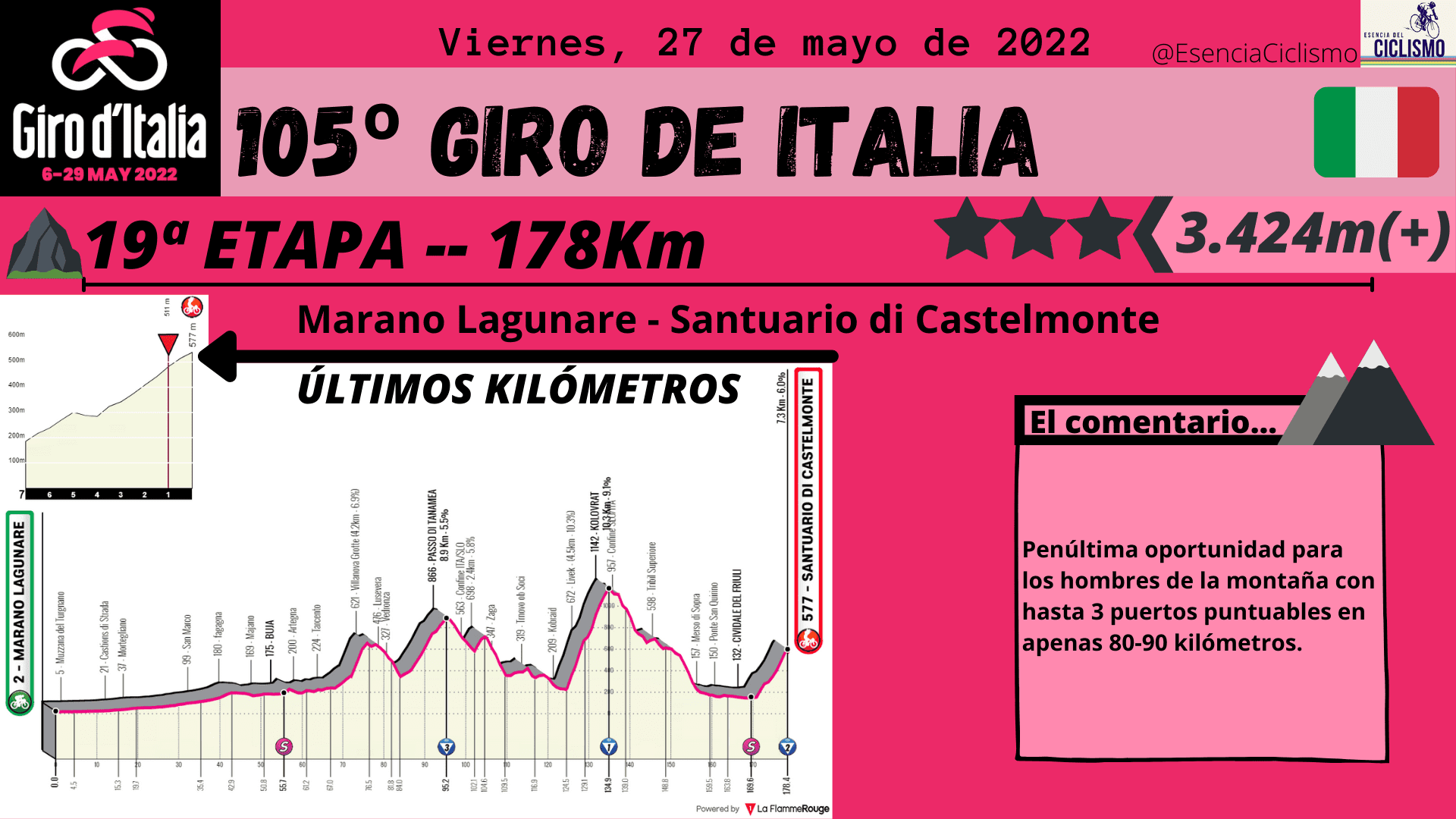 Las tres primeras etapas del Giro de Italia se desarrollarán en suelo húngaro. La primera jornada ya esconde una trampa en la parte final con una ascensión donde las rampas máximas alcanzan el 14% y donde la primera maglia rosa deberá ser alguien de calidad. Además, la CRI de 10km prevista para el segundo día también esconde una ‘trampa’ en la parte final por lo que se verán más diferencia de las previstas. Por su parte, el último día en suelo húngaro está llamado para los hombres más veloces.