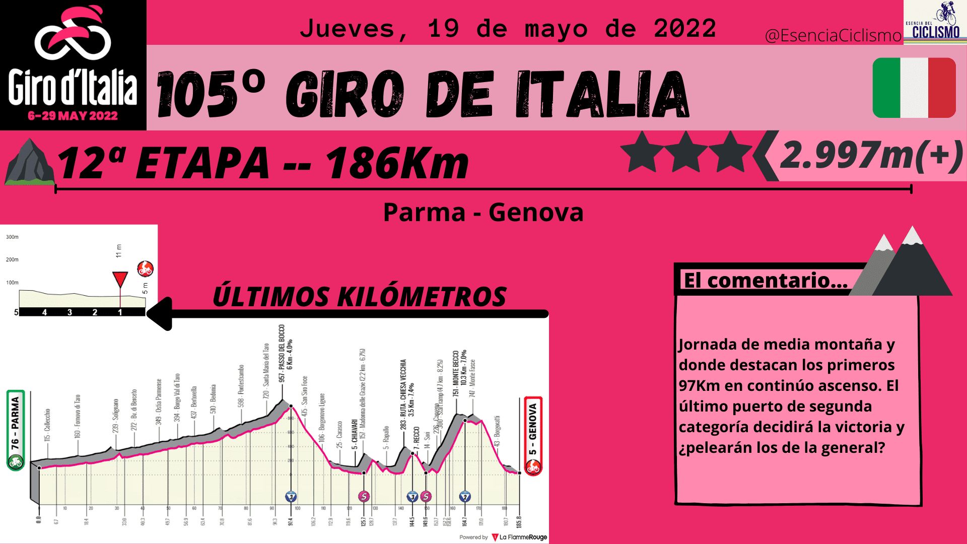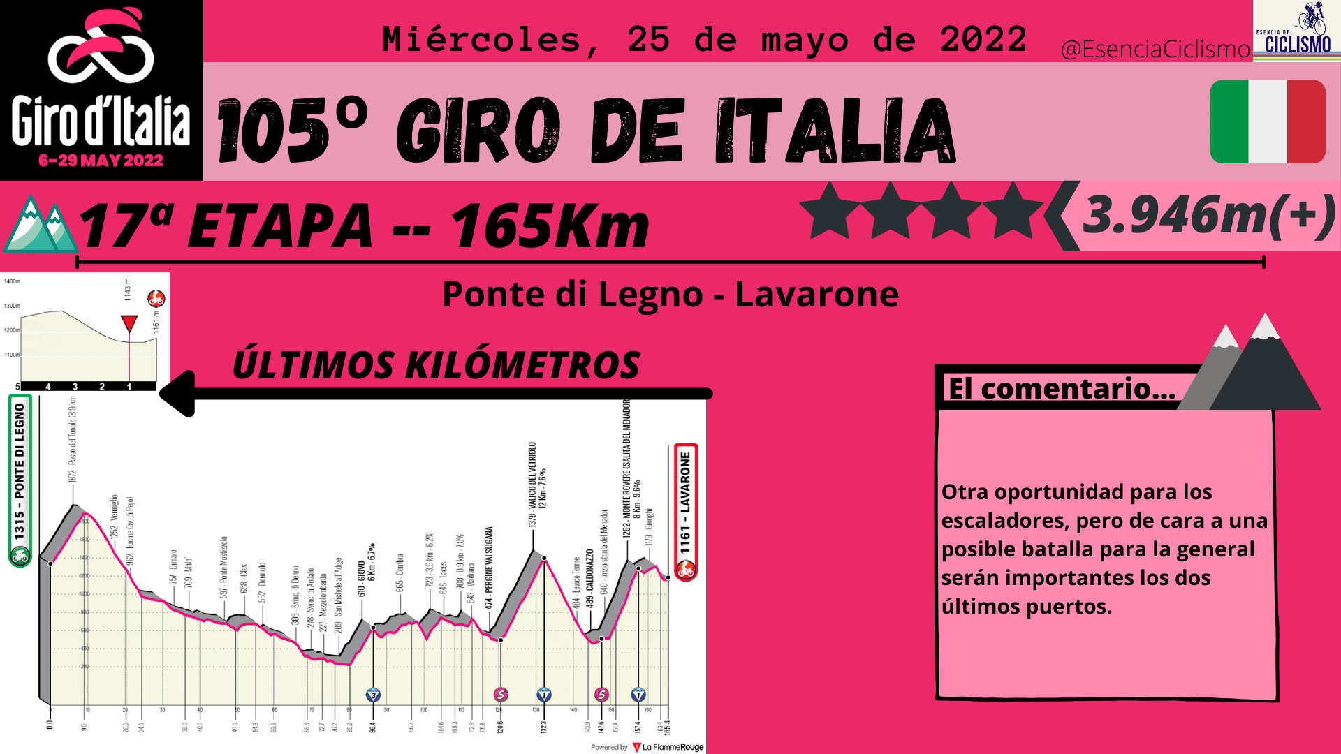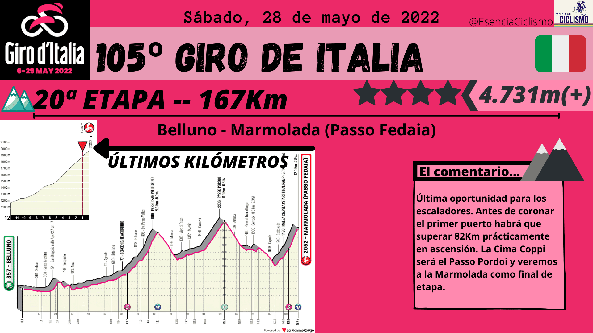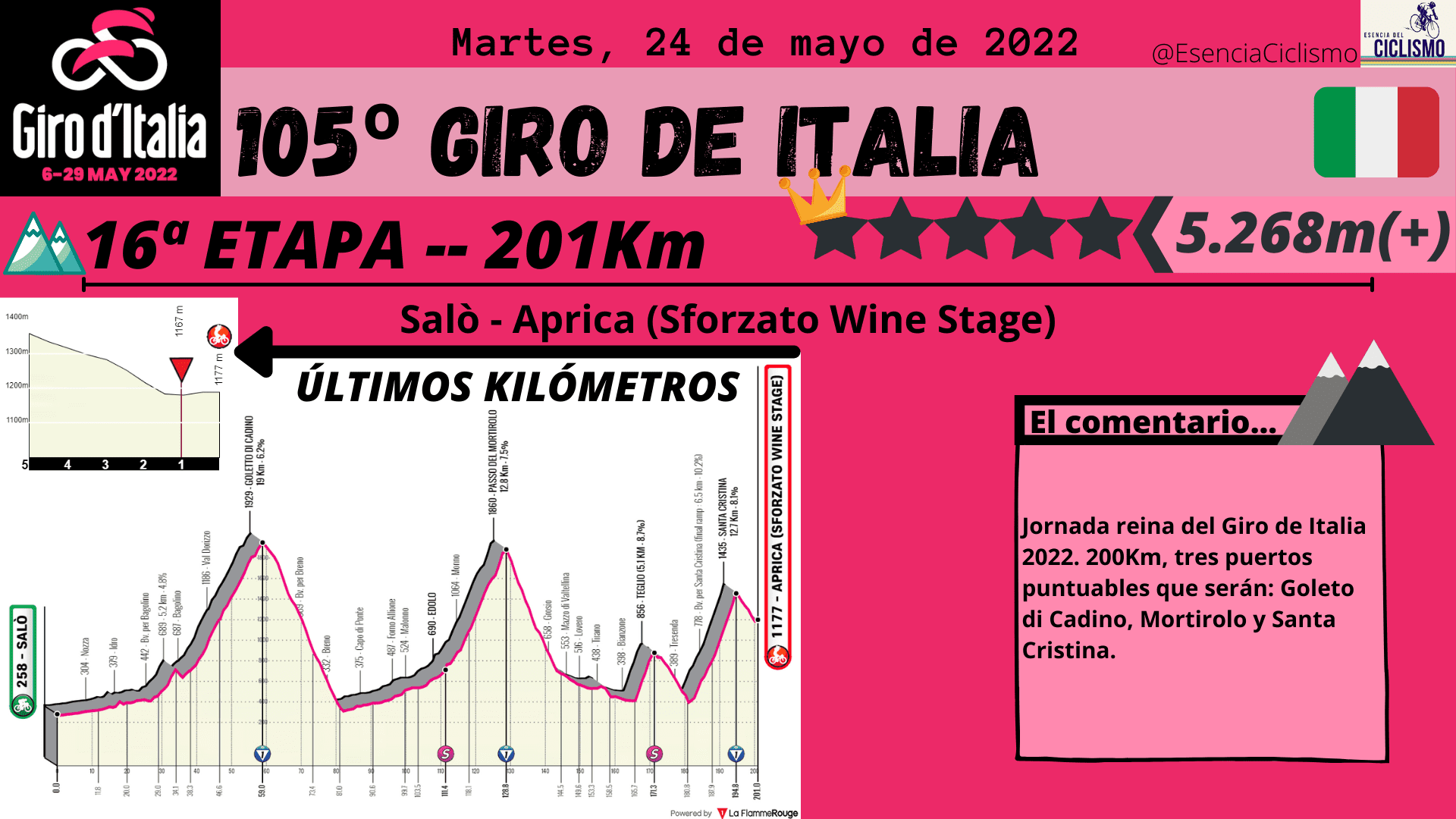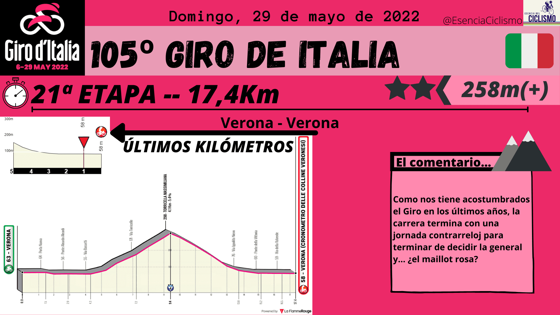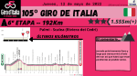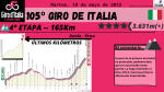 La última semana arrancará con curvas fuertes. Tras el día de descanso llega la jornada reina con 5.268 metros de desnivel positivo en 200Km donde se ascenderá Goleto di Cadino, Mortirolo y Santa Cristina. Al día siguiente tampoco habrá descanso ya que la jornada 17 presenta 165Km con dos ascensiones de primera categoría en la parte final. Después de un día de relativo descanso, veremos la etapa 19 catalogada de media montaña, pero con un final en alto. La última oportunidad para los escaladores llegará en la 20ª jornada con las ascensiones, prácticamente encadenadas, a San Pellegrino, Passo Pordoi (Cima Coppi) y el final en la Marmolada. Por último, el Giro de Italia acabará con una contrarreloj individual en Verona de 17Km y donde destaca una pequeña ascensión en la parte intermedia.