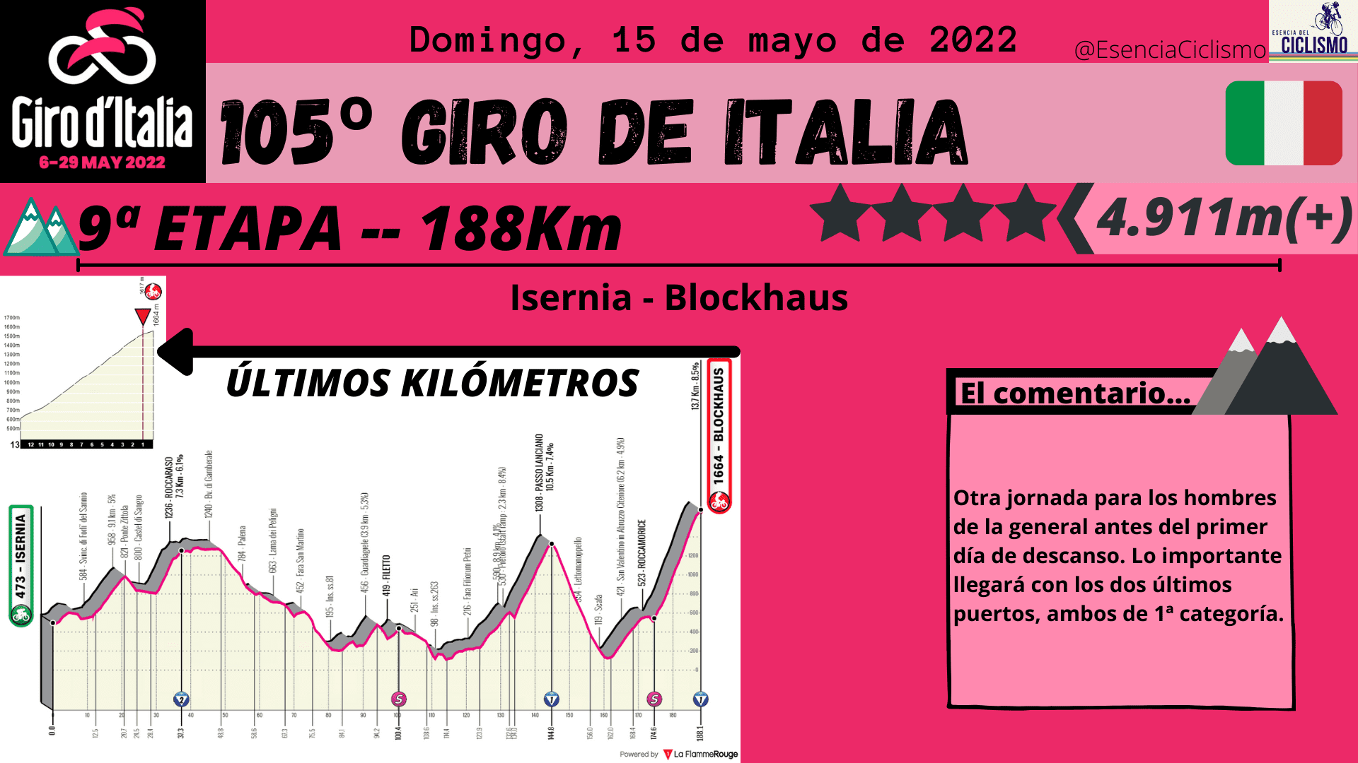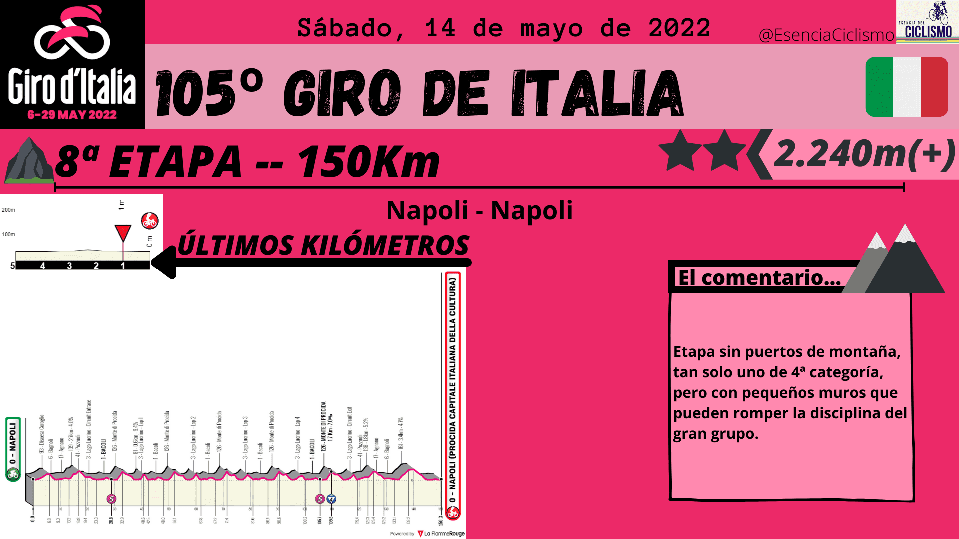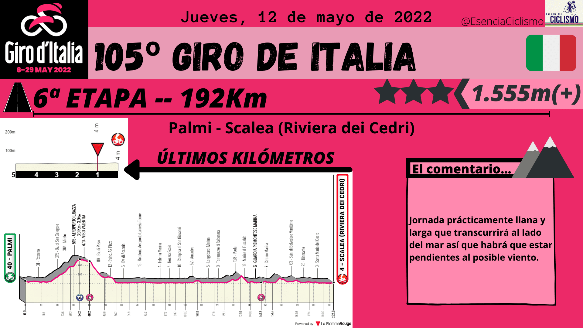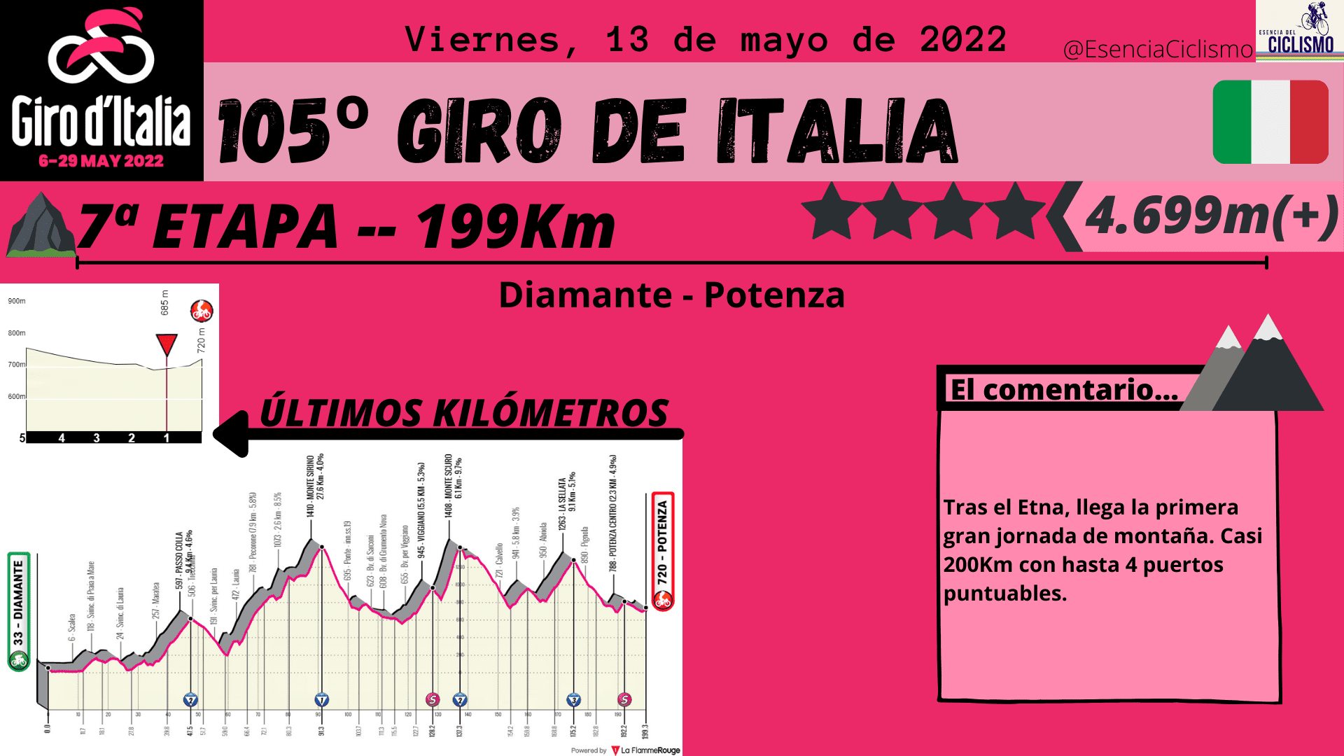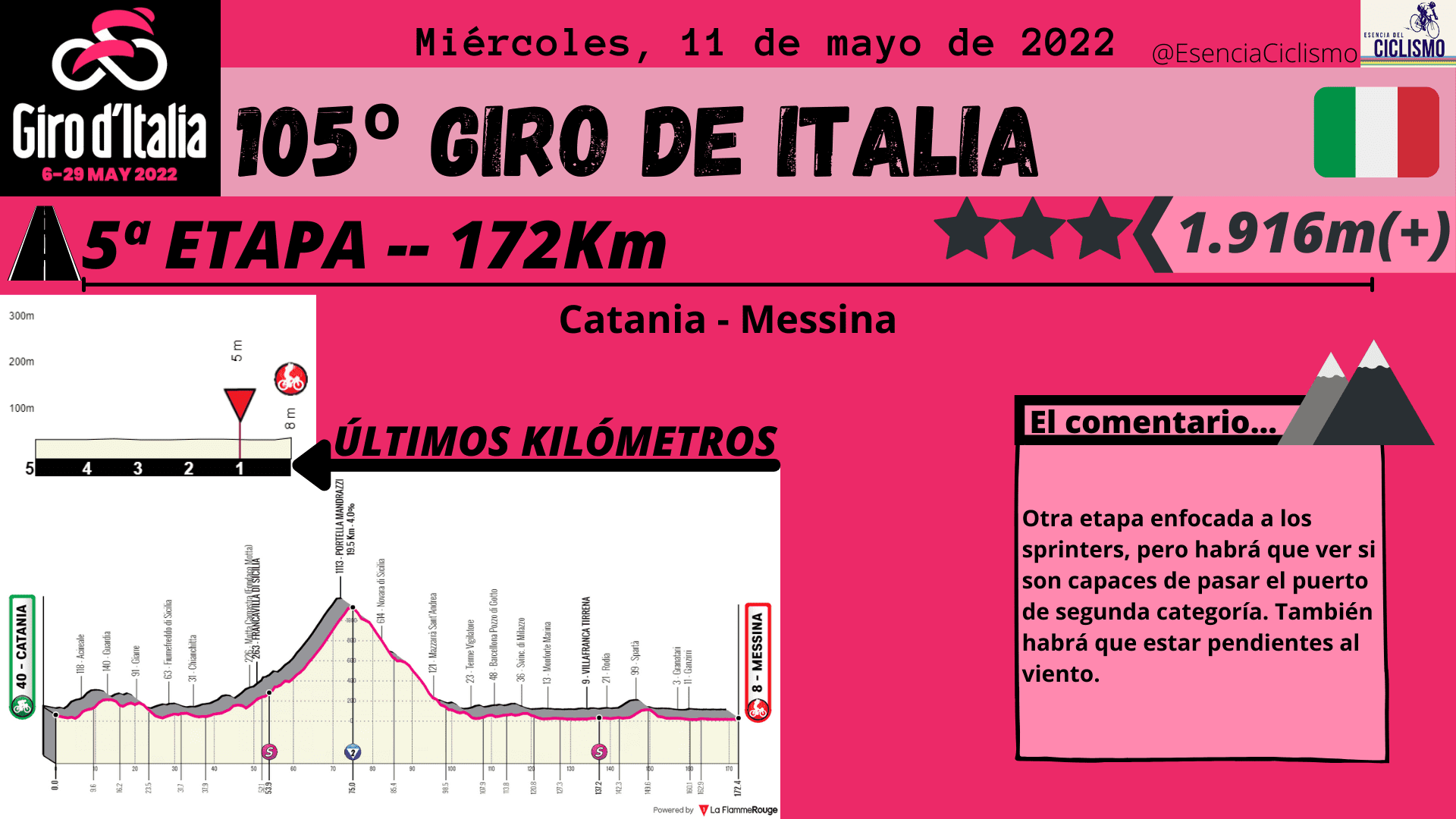 Lo más destacado en la primera semana de competición será la ascensión al Etna. Prácticamente 37km de ascensión continuada que marcarán las primeras diferencias importantes entre los hombres de la clasificación general. Además, esa primera semana se cerrará con la novena etapa donde se rozarán los 5.000 metros de desnivel positivo. Será otro día para la general donde podría empezar a moverse la carrera desde el penúltimo puerto. En cuanto a esta primera semana de competición, caben destacar las dos etapas llanas y las otras dos de media montaña donde resalta la 7ª con 4.700 metros de desnivel positivo y hasta 4 puertos puntuables.